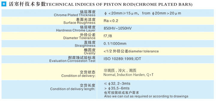 本產(chǎn)品表面經(jīng)特殊研磨及硬鉻電鍍技術(shù)外理,再經(jīng)鏡面拋光而成,具有耐磨擦、抗腐蝕性特性,可用作各種氣缸、油缸、包裝機(jī)械、木工機(jī)械、紡織機(jī)械、印染機(jī)械、壓鑄機(jī)、注塑機(jī)及其它機(jī)械的導(dǎo)桿、頂桿。